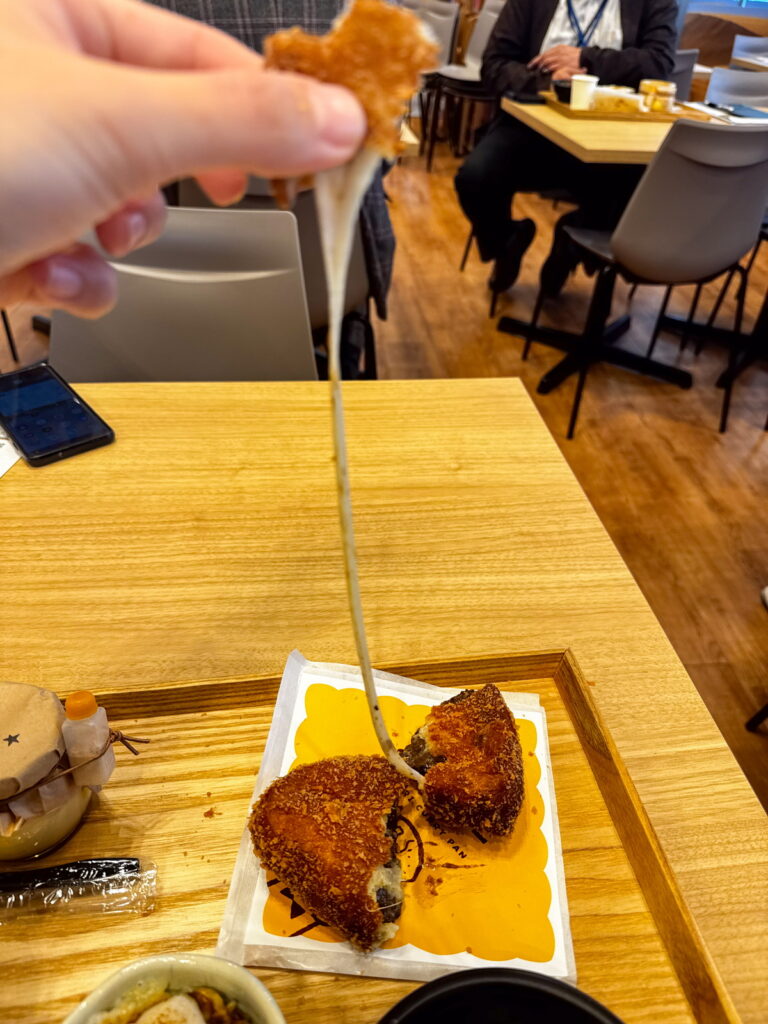 チーズカレーパンのチーズにねばりっこパウダーが加えられていて、熱々で販売されています。