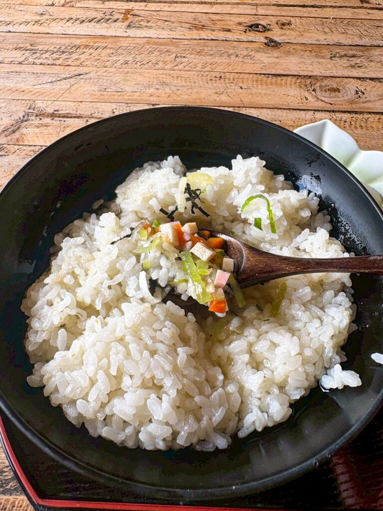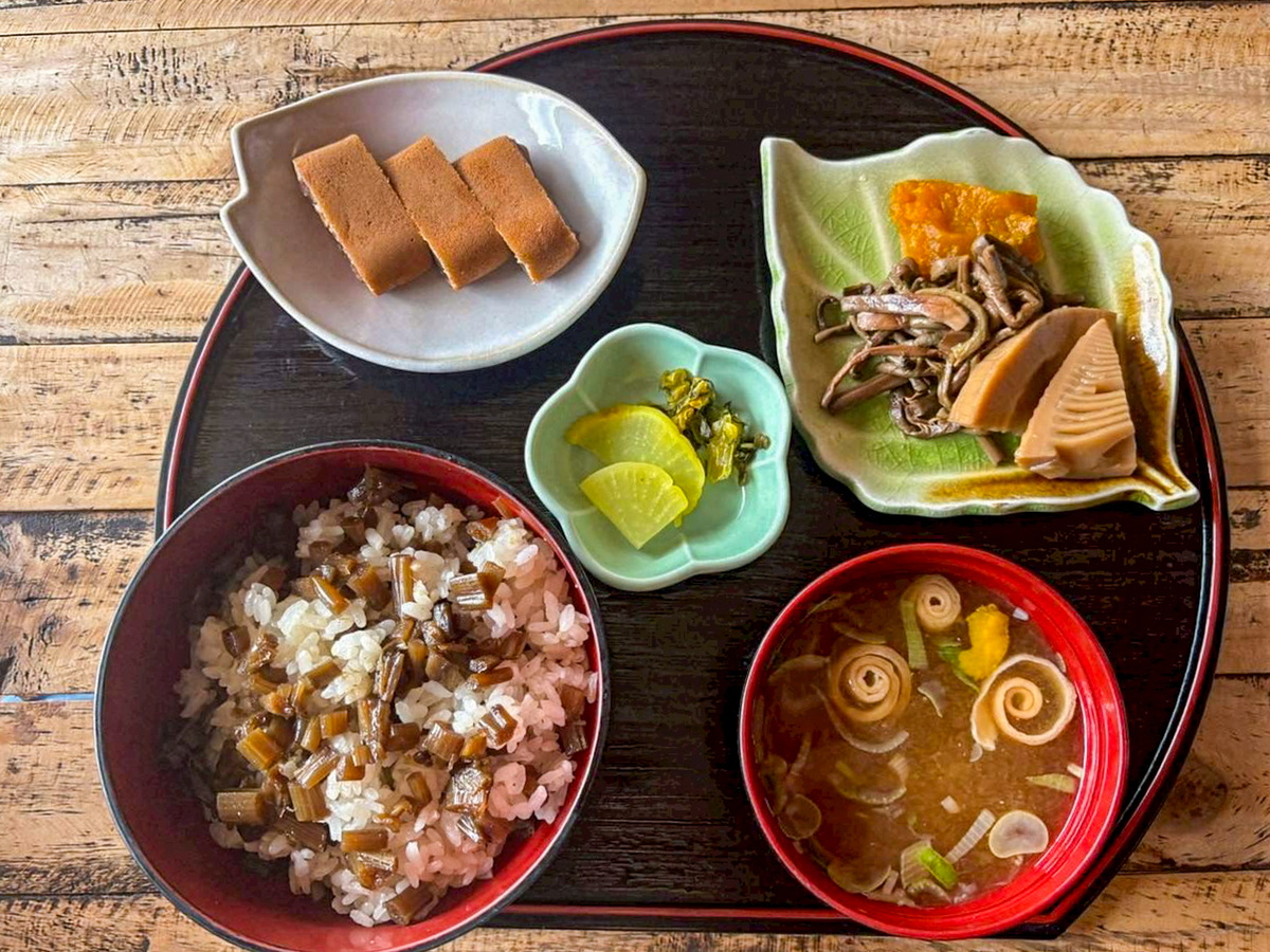 自家製ふき飯定食は、甘く炊いたふきがたっぷりとご飯に混ざっていて、お箸が止まりません。