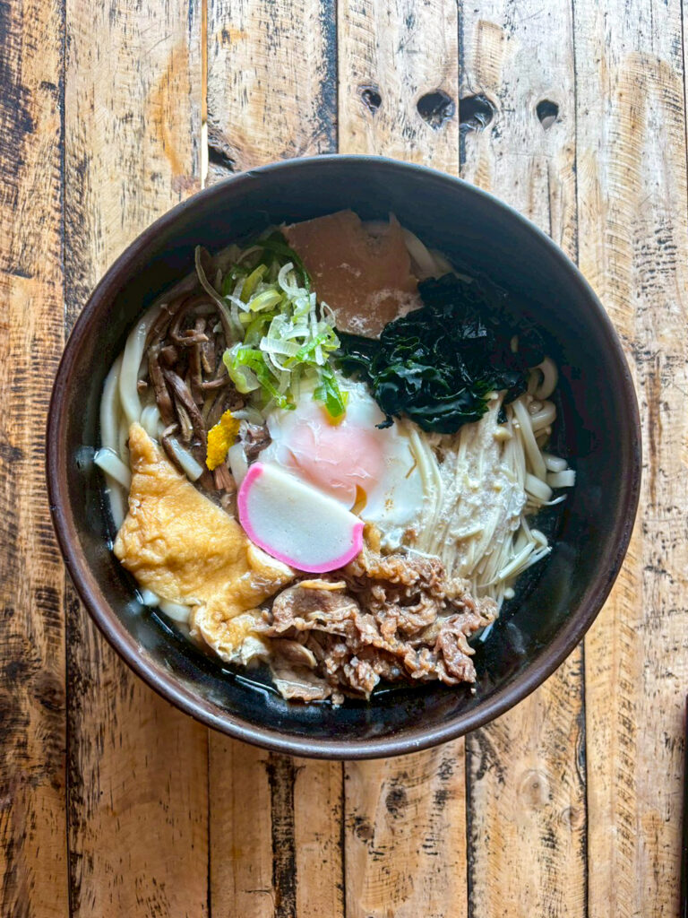 玉子、油揚げ、牛肉、筍、ぜんまい、えのき、わかめと、とにかく具材がしこたま入った人気の一杯。