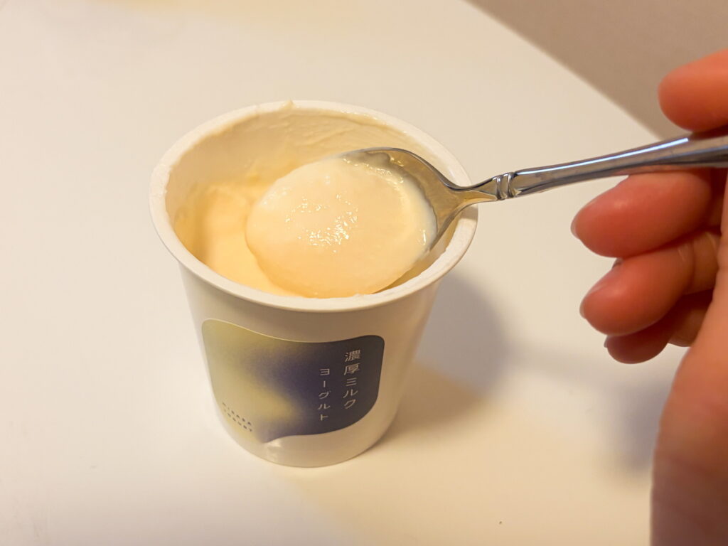 私がいつも食べるヨーグルトと比べて黄色っぽく感じます。ミルキーさがこの色に表れているのでしょうか。よ~く混ぜ混ぜします。