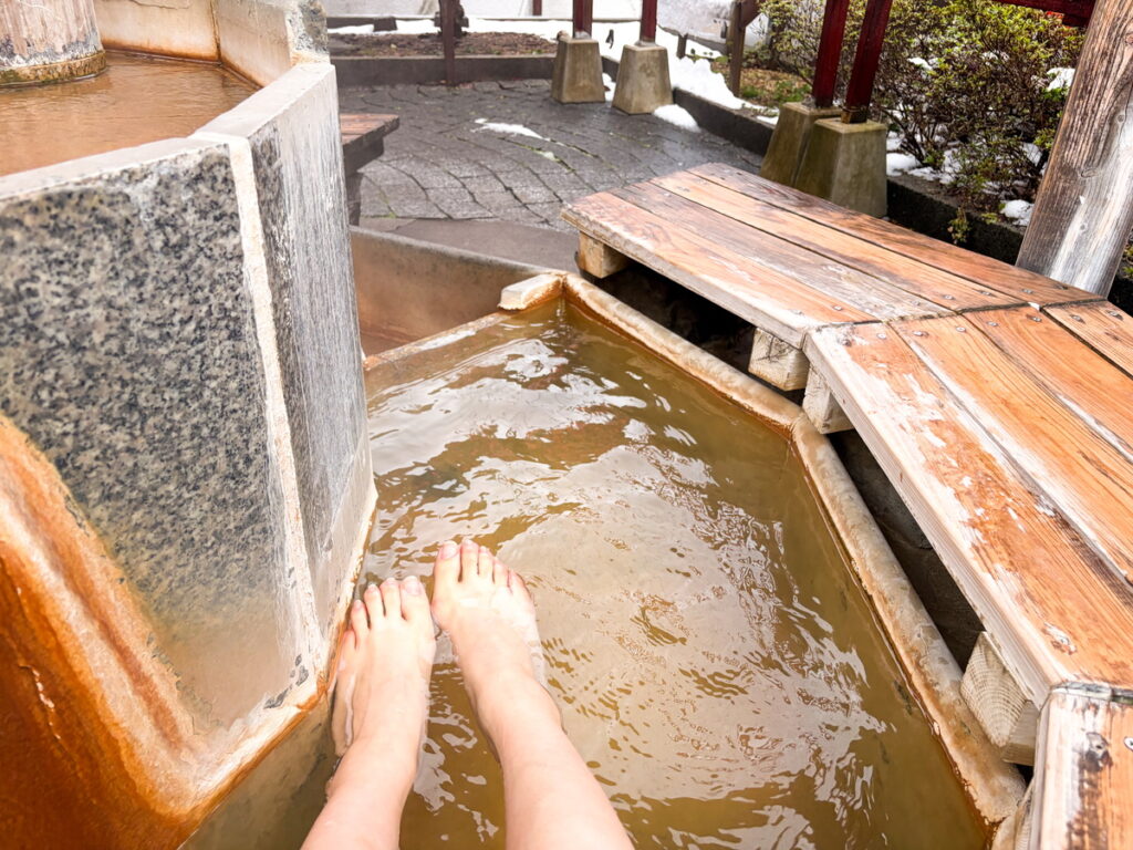 CAの仕事は足腰の健康が不可欠です。元気にフライトができるようにお祈りしてから足湯に浸かりました。