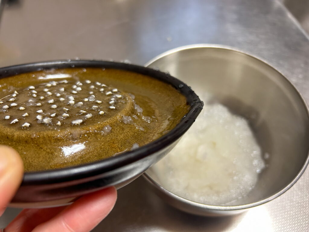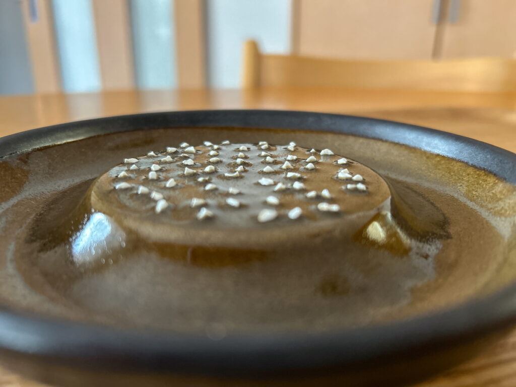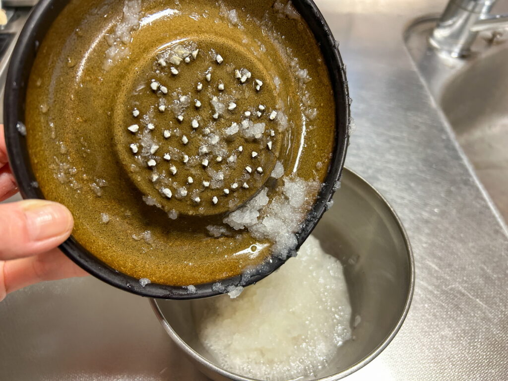 このおろし器の刃の部分には、ガラス質のコーティング、釉薬がかかっているようで、つるつるとした質感になっているので、食べ物が絡みにくく作られているそうなんです。