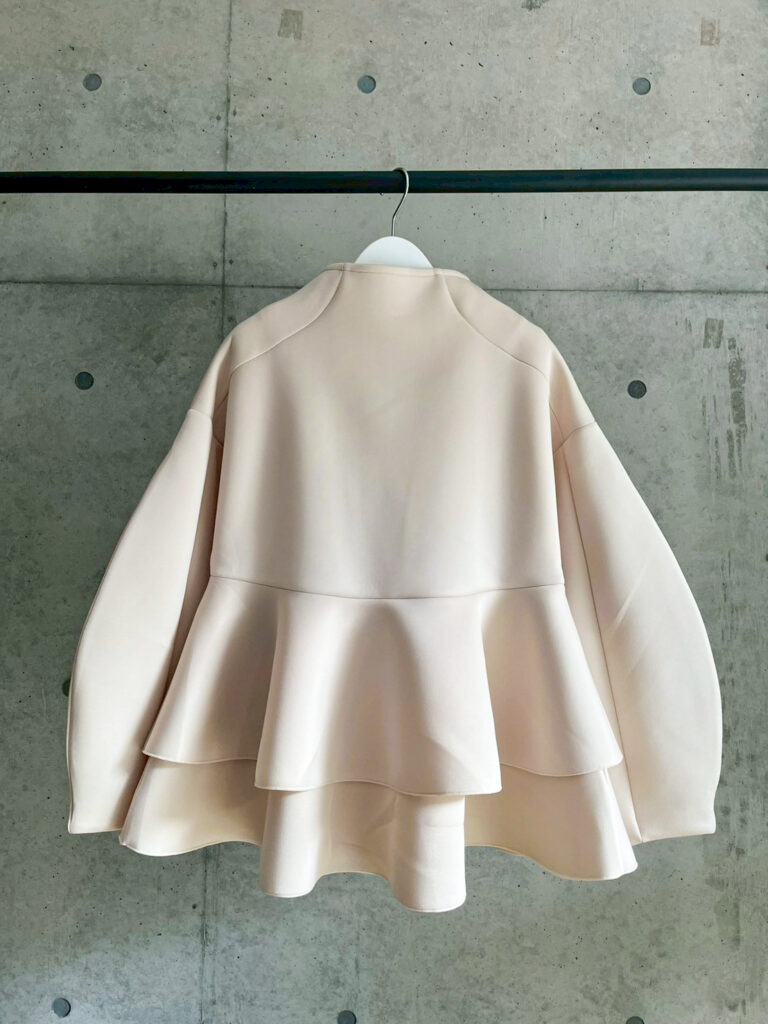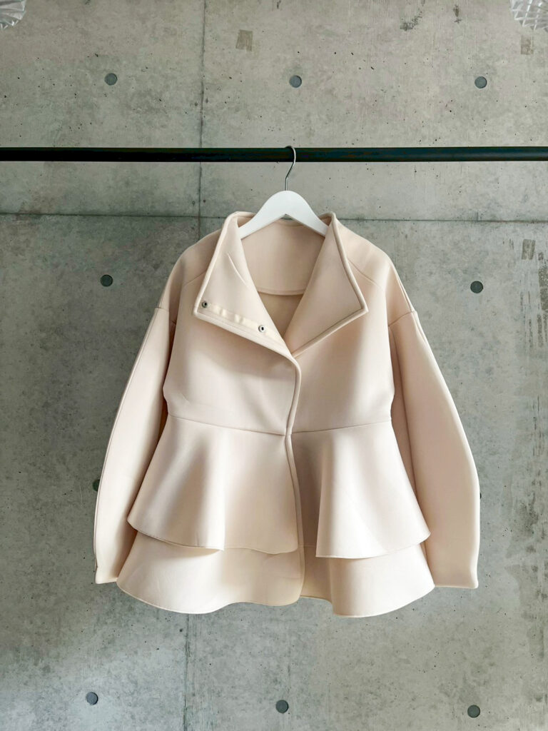 立体的なペプラムシルエットのお洒落なアウター!程よいハリ感のある素材だけども、どこか女性らしい曲線を描いたデザインもあり、とっても柔らかな印象を与えてくれる一品です。しかも生でみた方が圧倒的高見え。