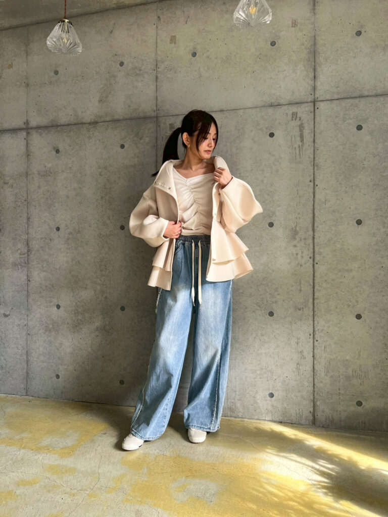 もちもちとした素材が着心地も良いですし、何よりおしゃれ見えするのに着回し力もしっかりありました。巷で大人気の『ペプラムボンディングジャケット』は、パッと羽織るだけでコーディネートに自信をくれる神アイテムなのでした。