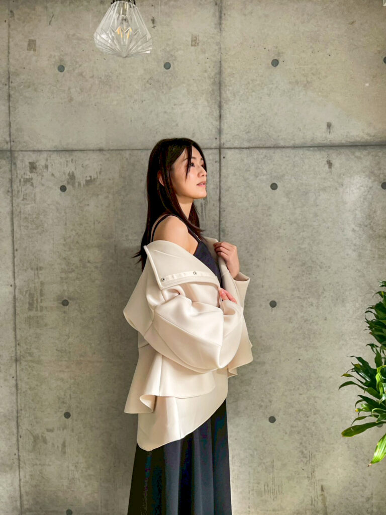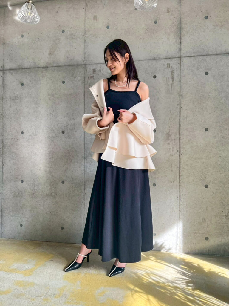 次に、ホテルディナーやなどちょっとした特別な日を意識したコーデに合わせてみました。シンプルな黒のキャミワンピの上品さに対し、アウターを添えることでよりエレガントな雰囲気へと格上げしてくれました。前を閉じてブローチを付ければセレモニーにも使えるのも嬉しい◎。