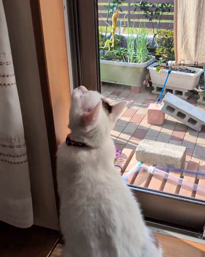 上の方をじっと見つめ、すっと手を伸ばしたと思ったら、目線の先にいたのは…