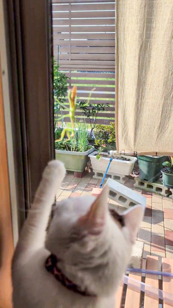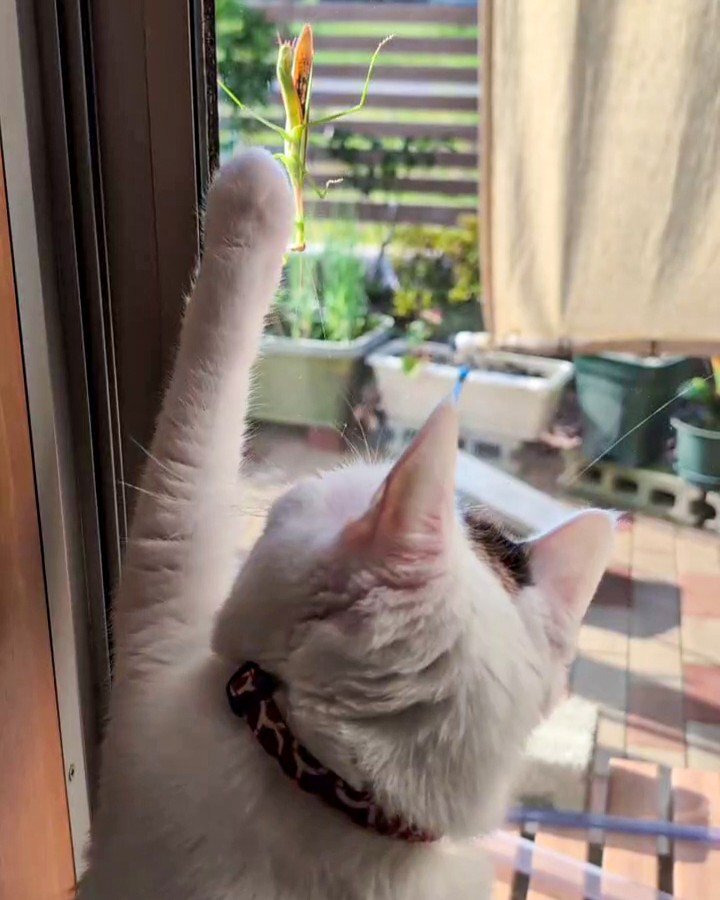 窓の外で安心しましたが、それでも手でカマキリをちょいちょいとする姿にはちょっとヒヤヒヤ…。
