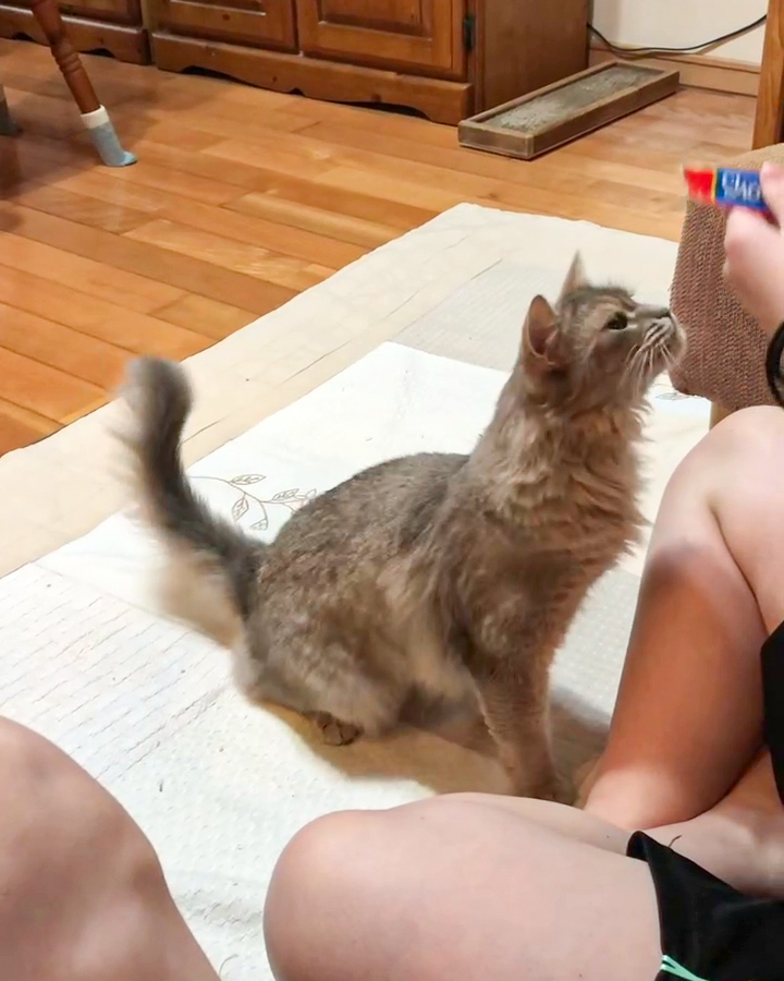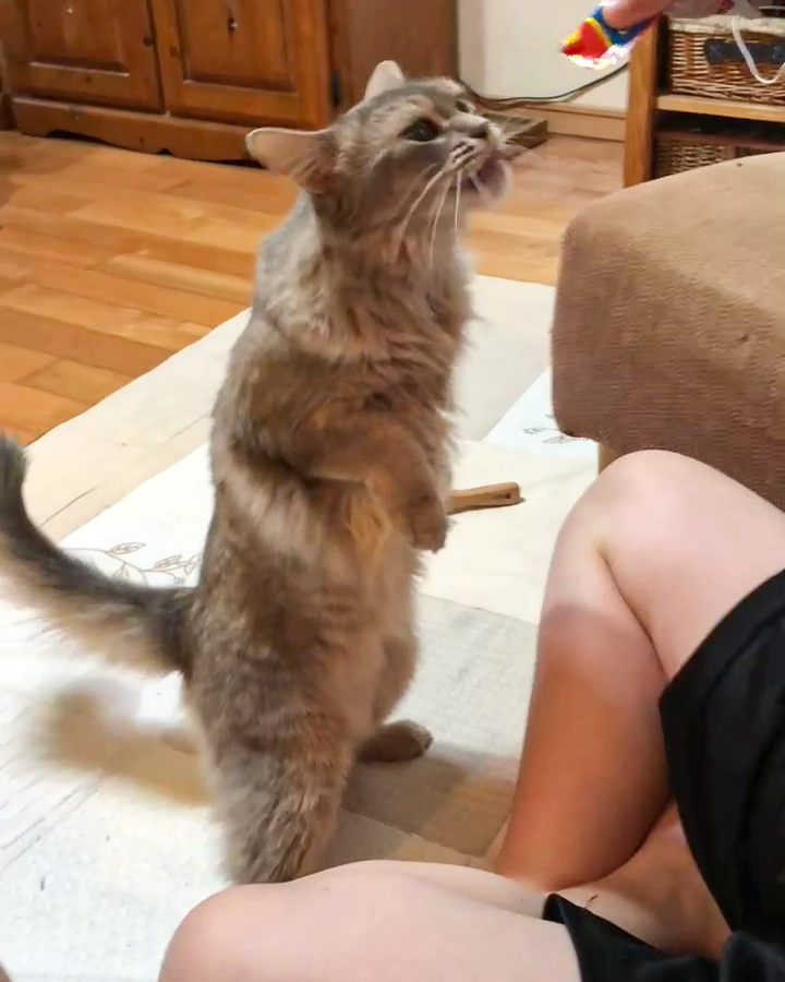 チュールが大好きだそうで、飼い主さんが高い位置にチュールを持ってくると…