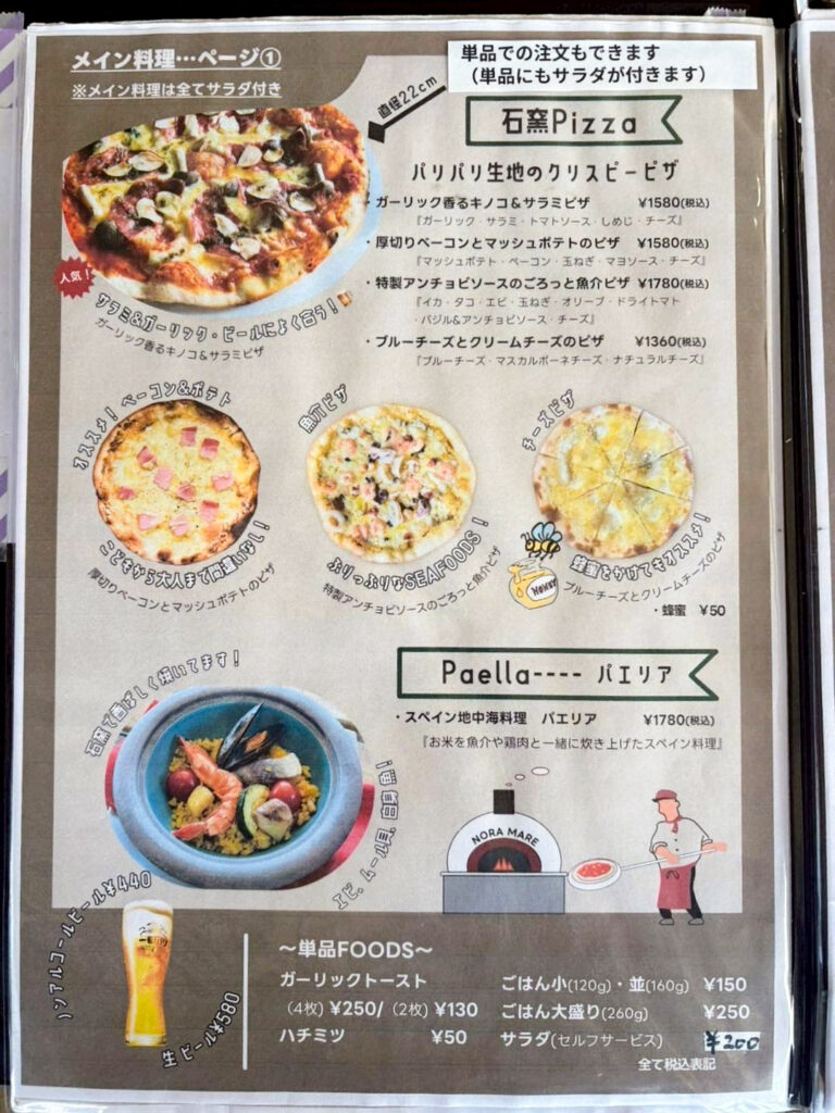 メイン料理は、石窯で焼いたピザ、ハンバーグ、そしてパエリアもあって、どれも美味しそうで迷いましたが、パエリア(1780円)とお店オススメの厚切りベーコンとマッシュポテトのピザ(1580円)に決めました♪
