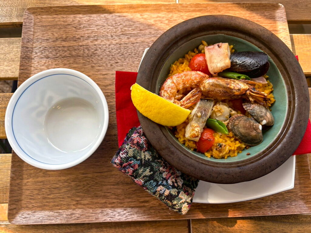 アツアツのパエリアは大きなエビ、ムール貝、アサリ、白身魚などの海の幸がたっぷりと乗っていました‼