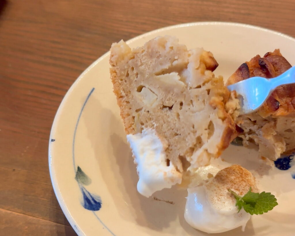りんごのケーキは、大きめのりんごがゴロゴロ入っていて、シナモンがしっかり効いて満足感たっぷり。