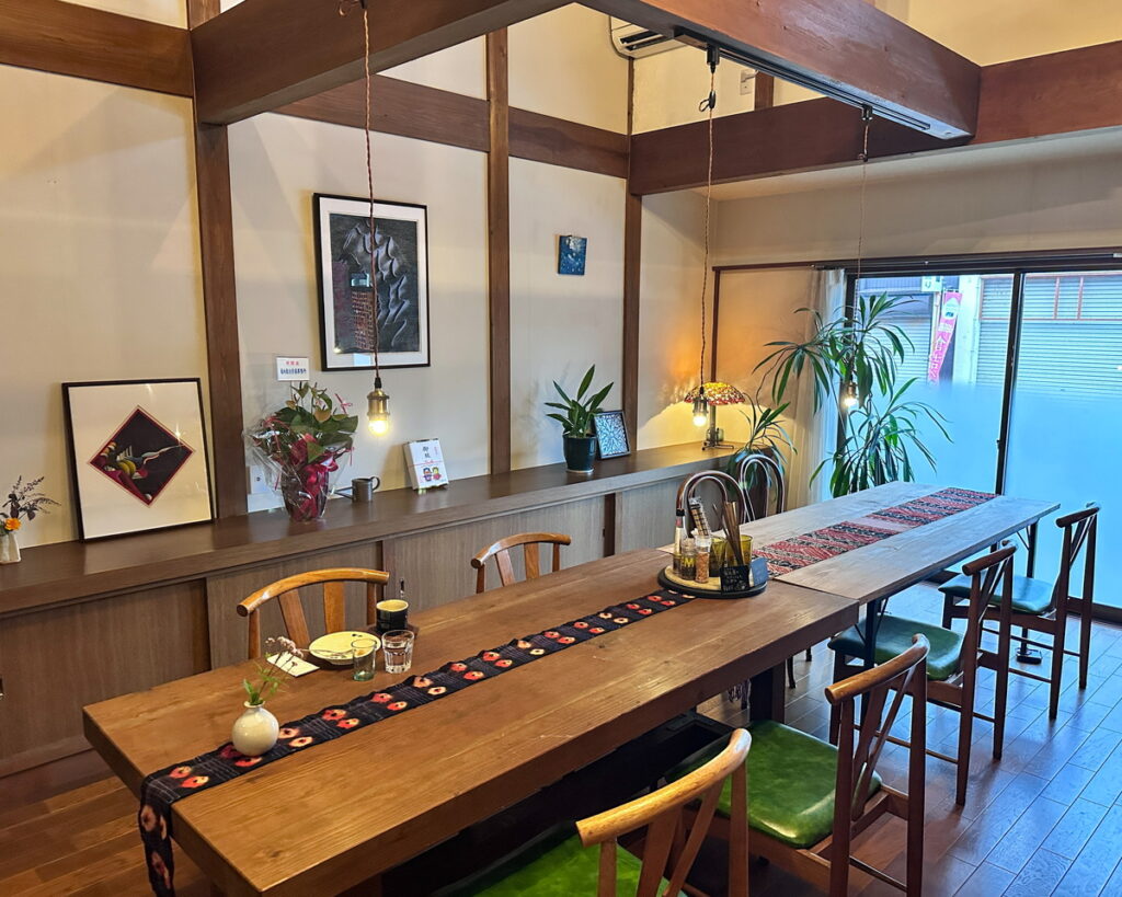 長いテーブルを2つ並べたテーブル席があり、グループでの来店にも対応しています。