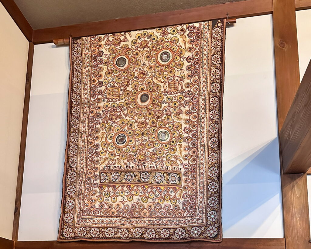 鏡のような光沢をもつ小さなパーツを布に縫い付け、刺繍を施した壁掛けで、インドなどで伝統的に作られている装飾品です。