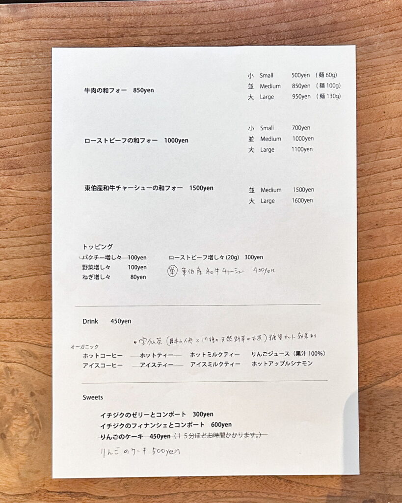 3種類のフォーがあり、それぞれ麺の量、トッピングが選べるようになっています。