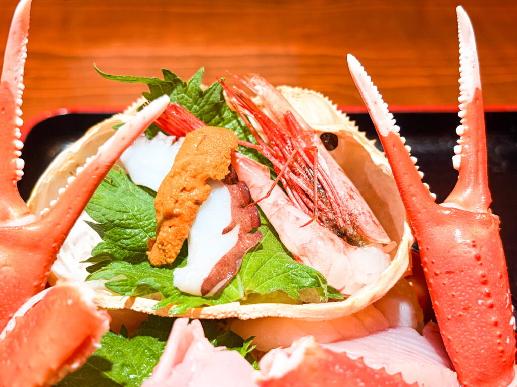 カニのつぶらな瞳に見つめられながら、ウニとタコ、甘エビに手を伸ばします。臭みがまったくなくて新鮮なネタのありがたみを感じます。