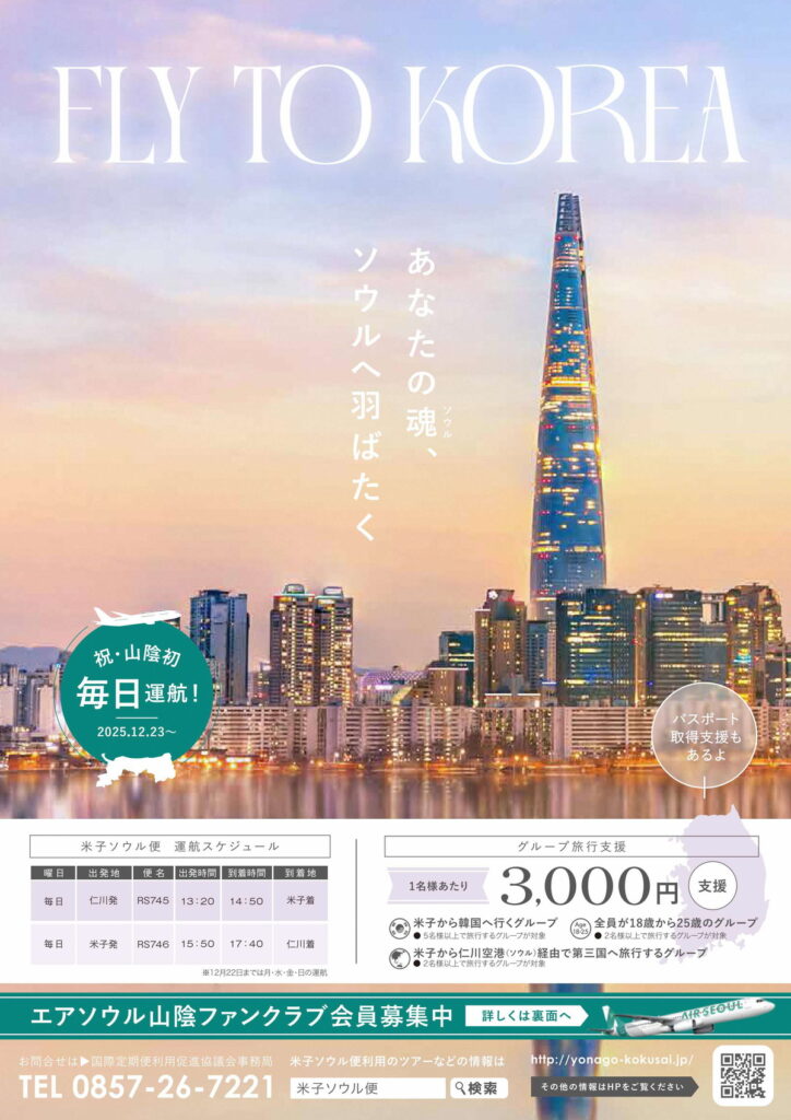 12月23日からの米子-ソウル便は、米子からは毎日15:50発の17:40着。ソウルからは13:20発の14:50着。