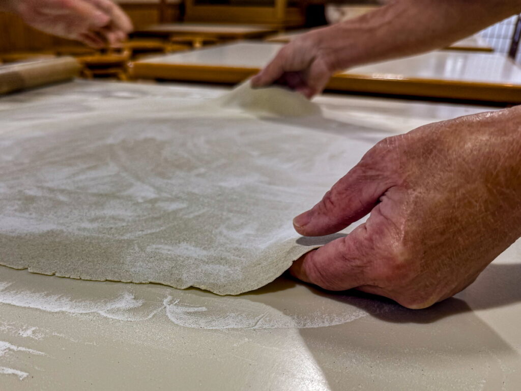 最後はそば切り。そば切り包丁で均等に切る作業は見ていると単純な作業に見えますが、実際にやってみると奥が深い工程です。