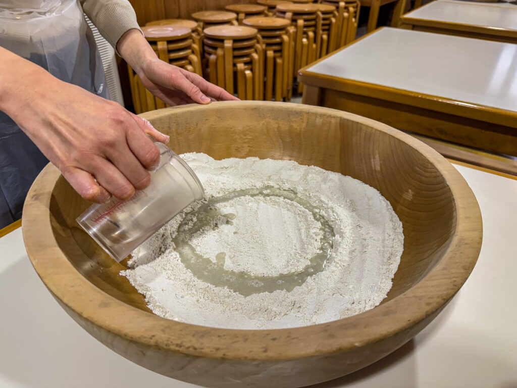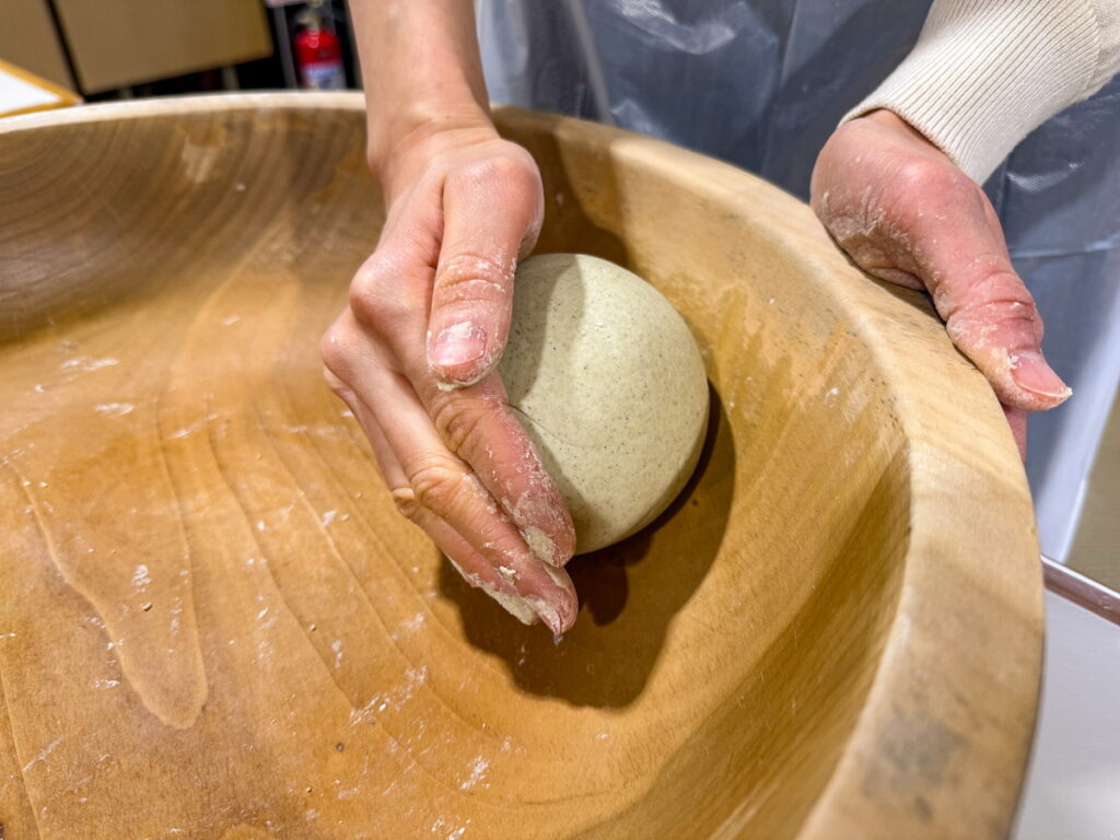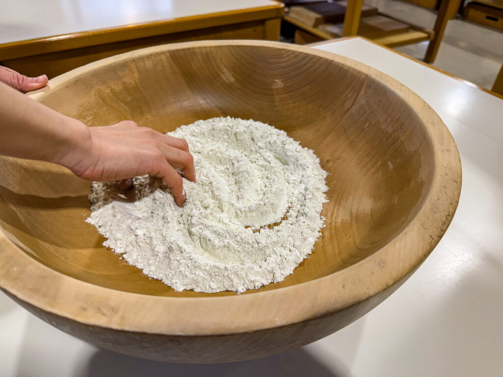 2:8(小麦:そば)の粉に水を複数回に分けて混ぜます。粉に液体(水)を混ぜるので最初は抵抗している様子を感じますが徐々に”手”を取り合って協力し、美味しいそばを目指します。