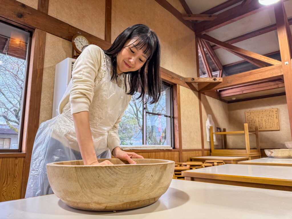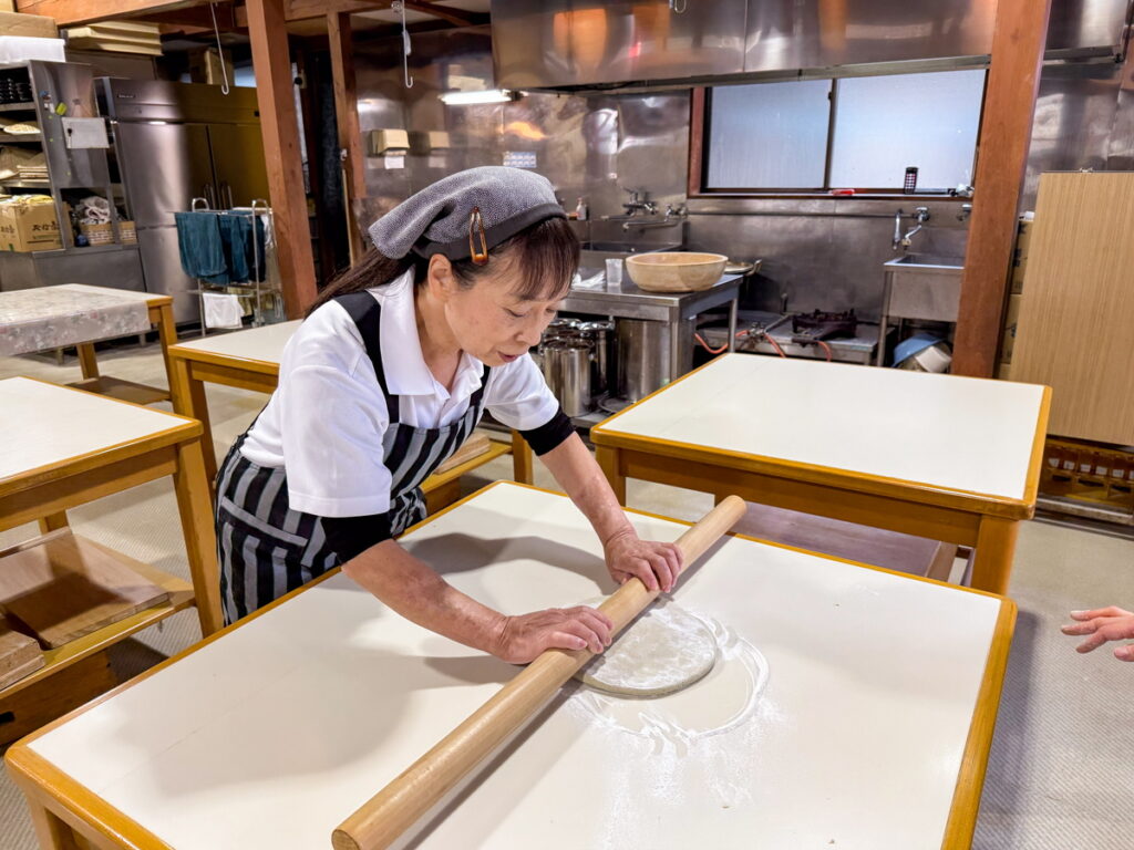 そば打ちを教えてくれたスタッフの方にお手本を見せてもらった時、手とめん棒が一体化していたことに驚きました!その瞬間はまるでめん棒が手の一部になって生地を伸ばしているようでした。