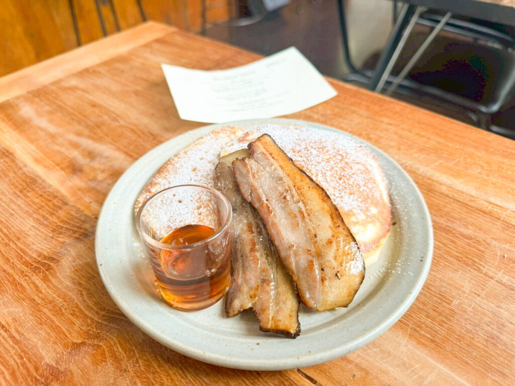 カリッと香ばしいベーコンと、しっとり甘いパンケーキの甘じょっぱさがたまらない組み合わせです。
