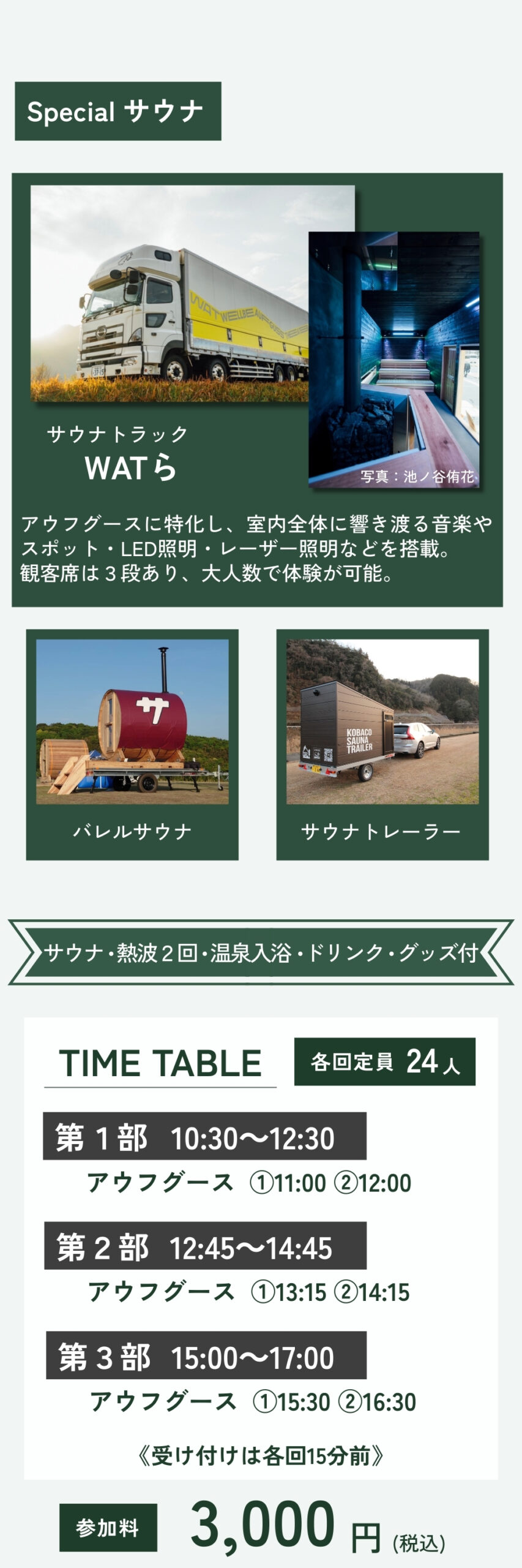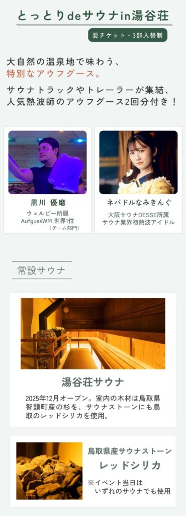 ーサウナイベント参加者は入浴が含まれています。また、サウナ参加者以外でも温泉施設の一般利用は当日も可能です。