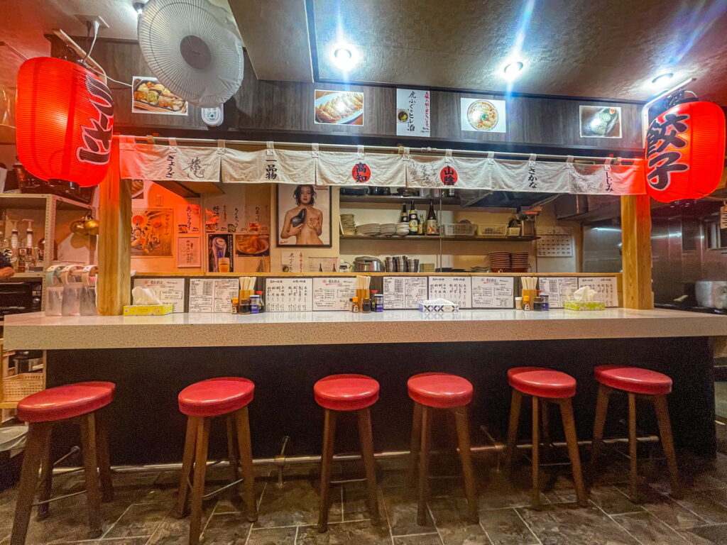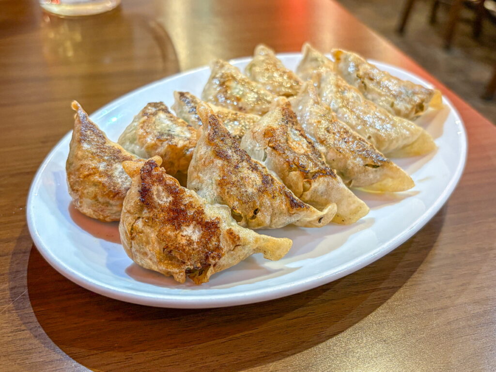 看板メニューの「屋台餃子」は、皮はパリパリ、中はジューシーでクセになる味。