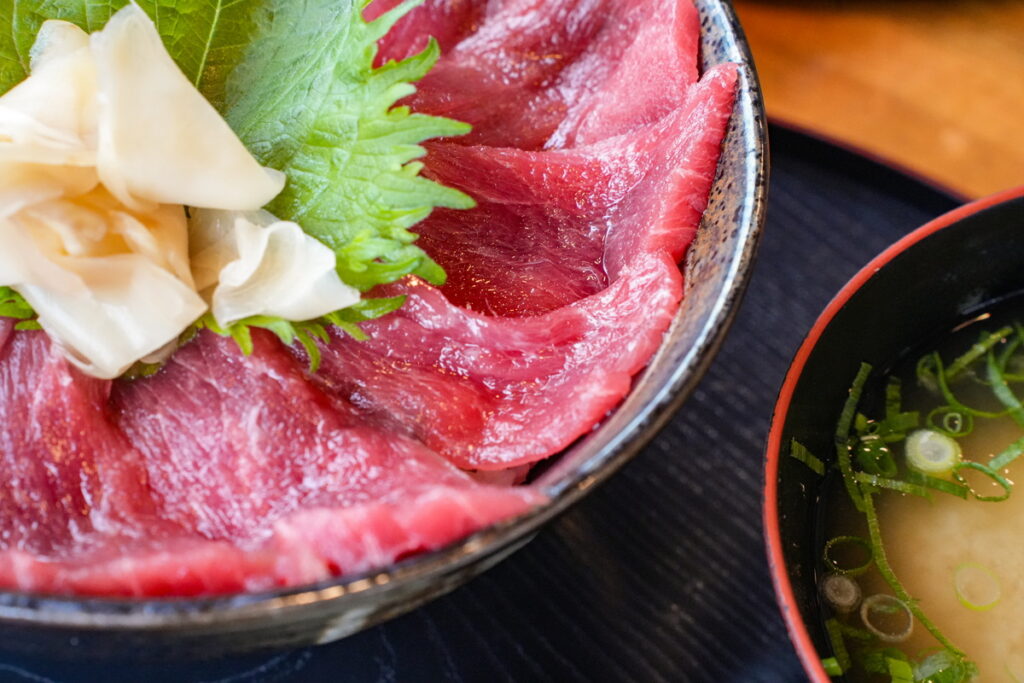 丼からはみでるほど、ぎっしりとマグロが敷き詰められています~!美しい…!